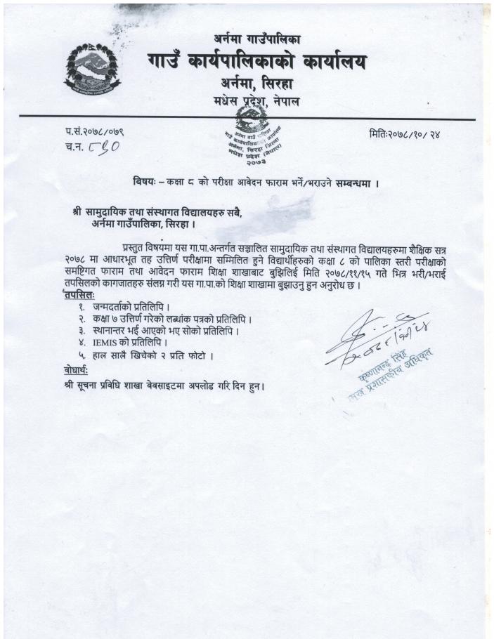 कक्षा ८ काे आवेदन फारम सम्बन्धमा ।