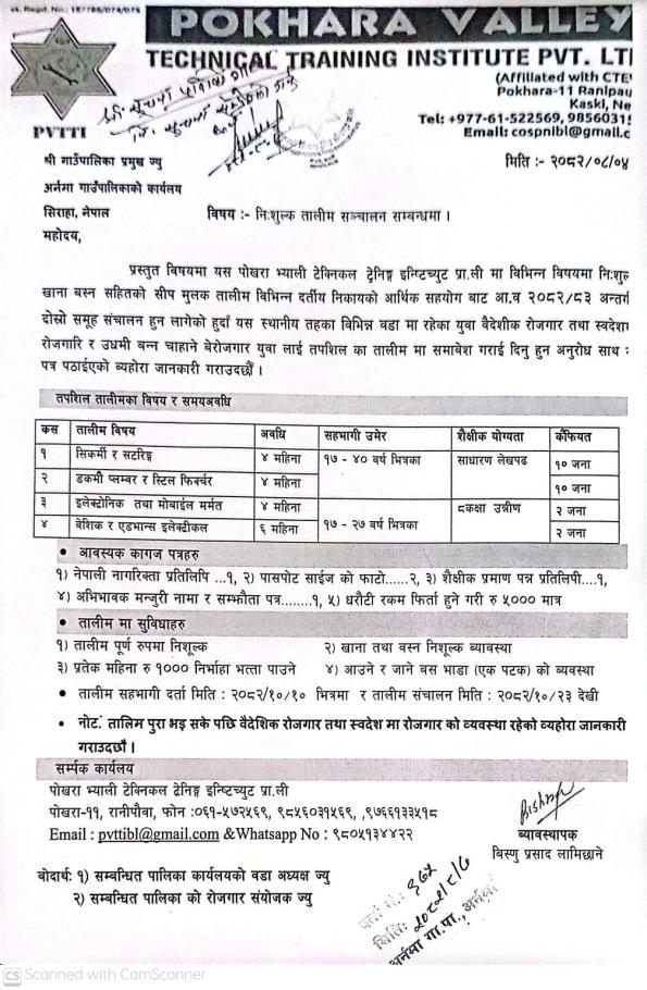 निःशुल्क तालिम सम्बन्धी सुचना ।